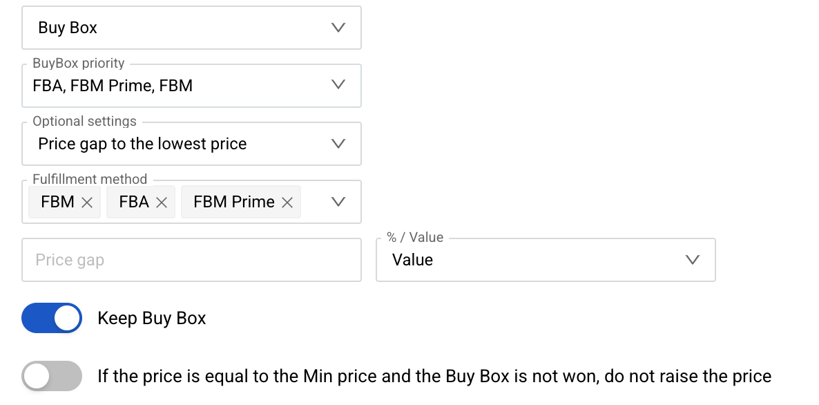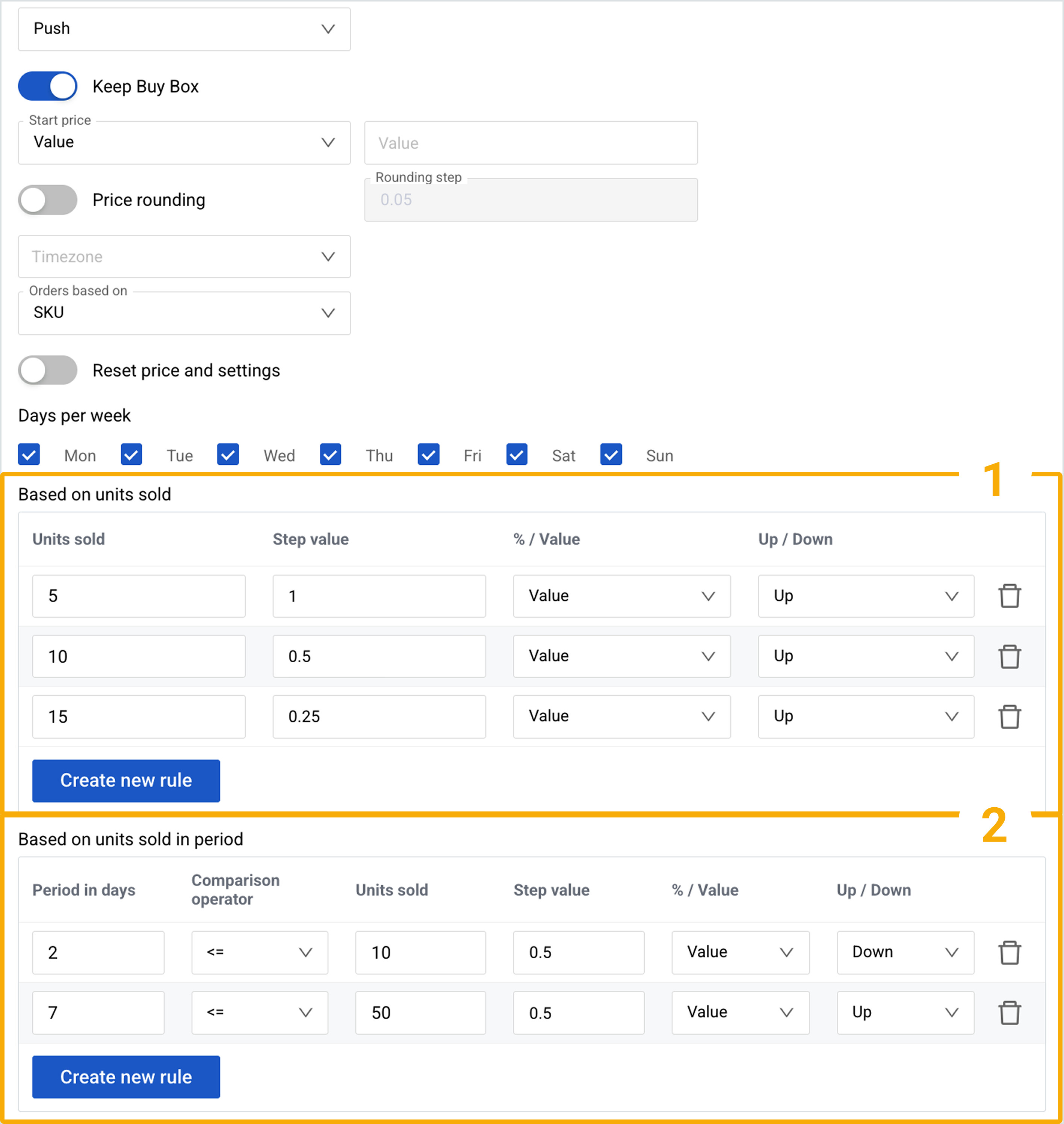 Set your own pricing rules and boundaries. Define minimum and maximum prices, adjust for product launches or seasonal promotions, and test how these changes change your visibility and conversion.