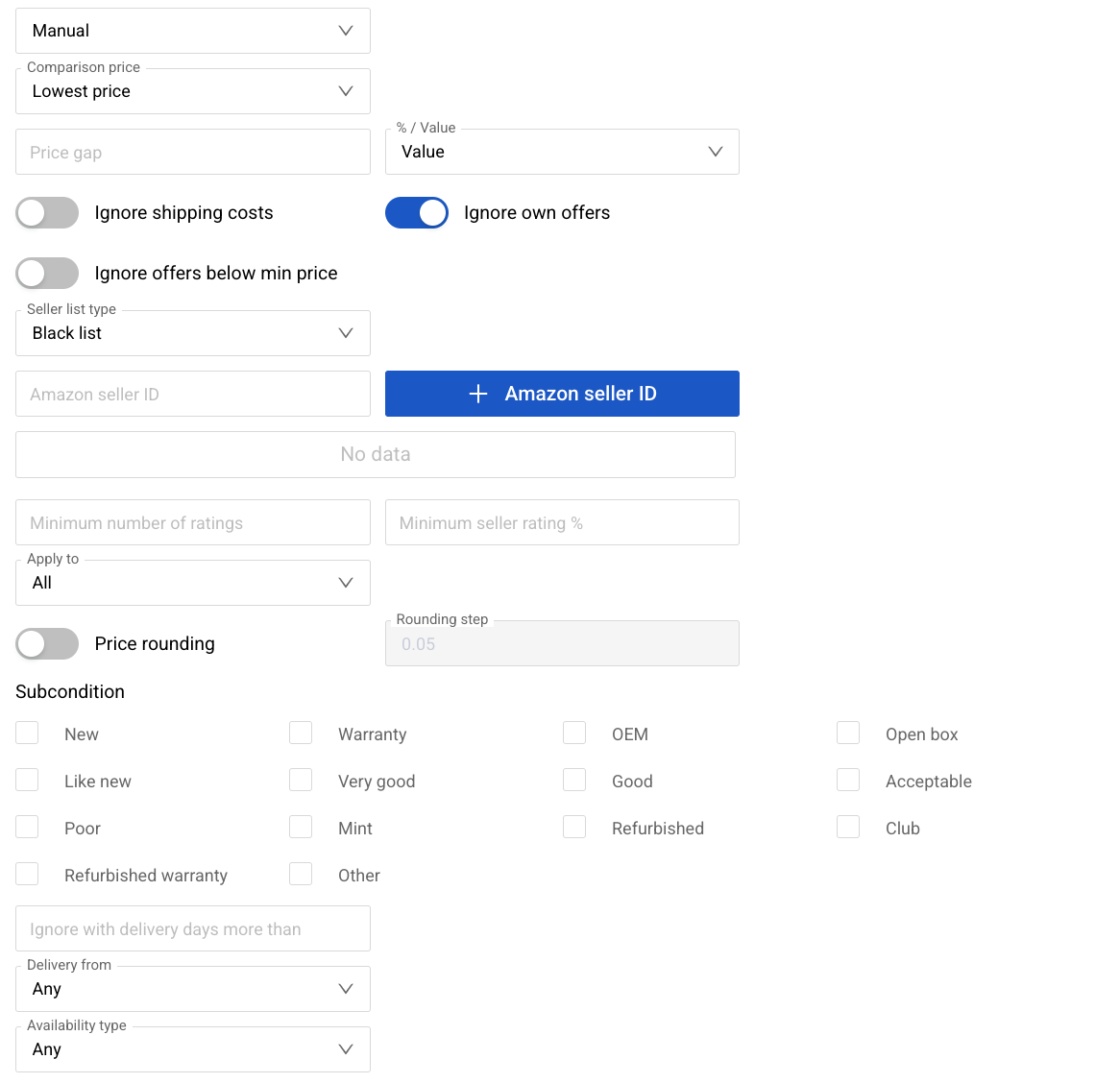 If you’re selling in competitive niches, identify up to 20 comparable ASINs and track their pricing trends. Find the ideal price gap (for example, staying 3–5% below the average). By reviewing and adjusting prices manually every few days, you can keep your offer attractive while also remaining profitable.